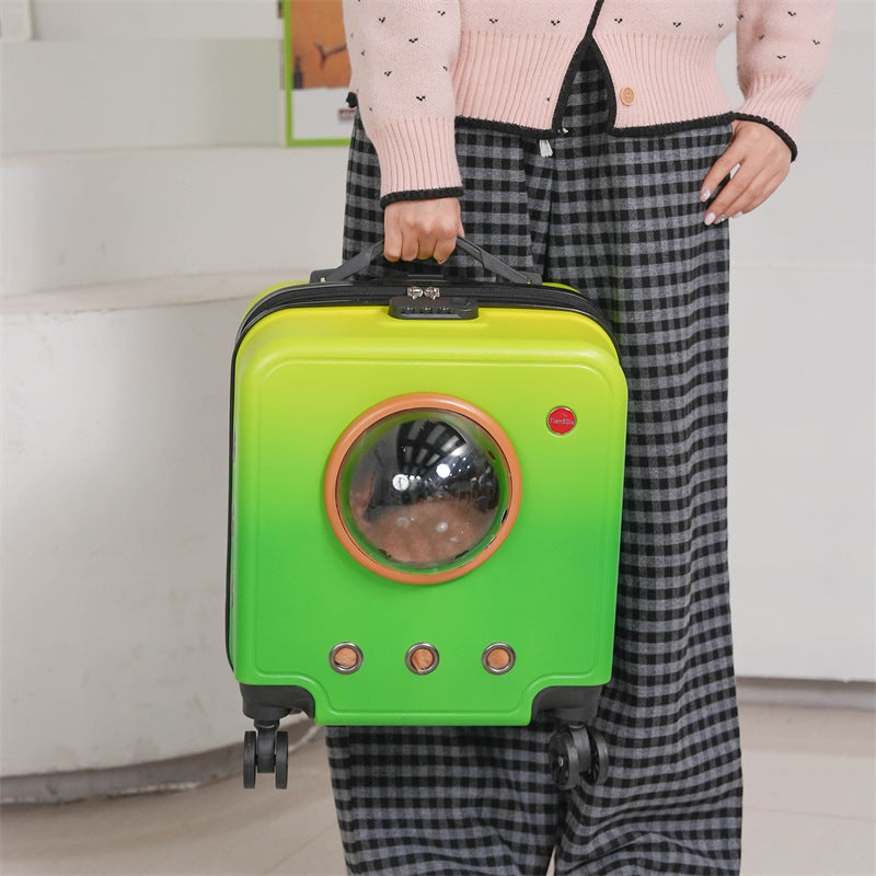 This wheeled pet carrier is made with both your pet’s comfort and your convenience in mind. The flat tie-rod handle extends for upright pulling and retracts for compact storage. The wheels glide effortlessly over indoor surfaces and smooth outdoor paths. Mesh ventilation windows on key sides ensure airflow and visibility — helping pets stay calm during movement. The interior is sized to allow your pet to stand up and turn around comfortably.