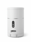 Design: The feeder has a clean, cylindrical shape with a white matte finish. The front features a recessed black panel with three distinct buttons and a light indicator. The buttons include a power button, a microphone button (indicating a voice recording feature), and a play/record button. Below the panel is a rectangular chute where the food is dispensed into a bowl (not included in the image). The base of the unit has a ridged texture, and the top is a simple, removable lid for refilling food.