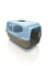 Materials and Colors: The carrier is made of durable plastic. The top portion is a light, pastel blue, while the bottom is a medium tan or beige. The side latches are a matching tan, and the handle on top is black. The door is a silver-toned wire mesh.