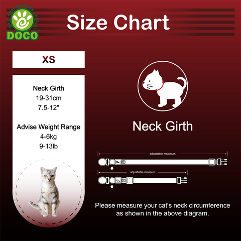 DOCO® LOCO Cat Collar with Safety Buckle are constructed with HIGH quality fun design printed heat transfer sublimation webbing. Collars provides a comfort fit between your cat’s collar and neck. Collar has safety release break away plastic buckle and tri-glide for an easy fitting on your cat. Heavy-duty stitching for lasting quality, Welded Metal D-Ring for attaching for the optional ID attachment for your cat’s tags.