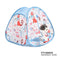 • Design: The tent has a pop-up, triangular shape with a lightweight, flexible frame. The fabric is a light blue and white color with a whimsical pattern of cartoon cats, fish, hearts, and paw prints. It features two openings: a large one on the front and a smaller one on the side, allowing the cat to enter and exit.
