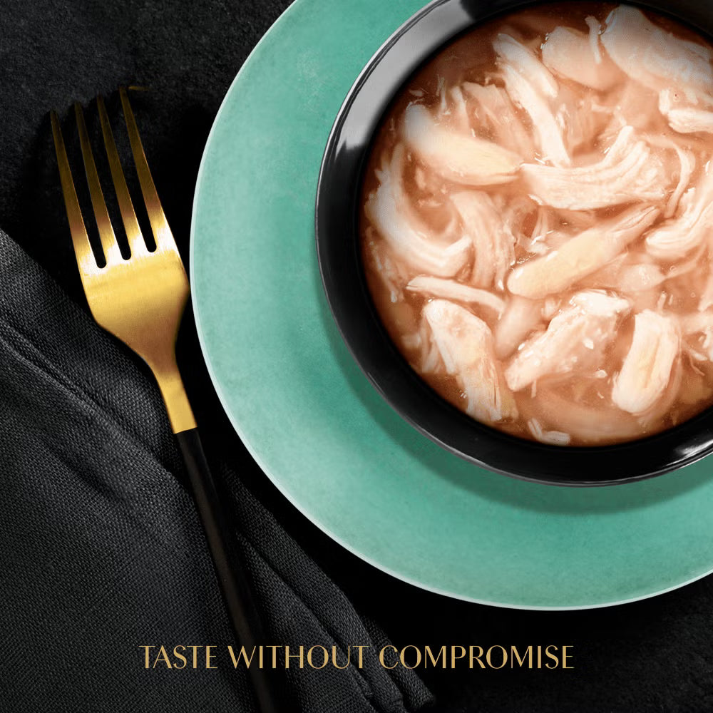 Indulge your feline companion with shredded chicken pieces in a rich sauce—designed for taste-sensitive adult cats that appreciate premium texture and flavour in every serving.