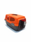 • Materials and Colors: The carrier is made of durable plastic. The top is a solid, bright orange color. The bottom is a dark gray or charcoal color. The handle and side latches are black or a darker shade of gray. The door is a silver-toned wire mesh.