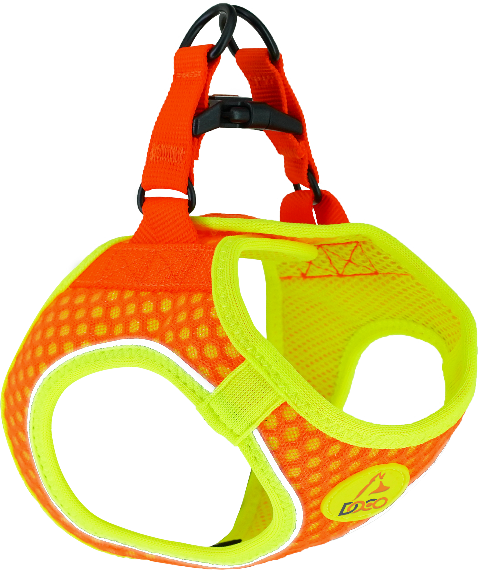 DOCO® Athletica QUICK FIT Mesh Harness, fray resistant 3mm thick high dense air mesh that provides ultra comfort on buddy’s neck and chest area. Less pressure around neck than classic collars for easier training and outdoor activities. Reflective piping throughout the entire vest harness for additional safety in darkness when walking the dog.