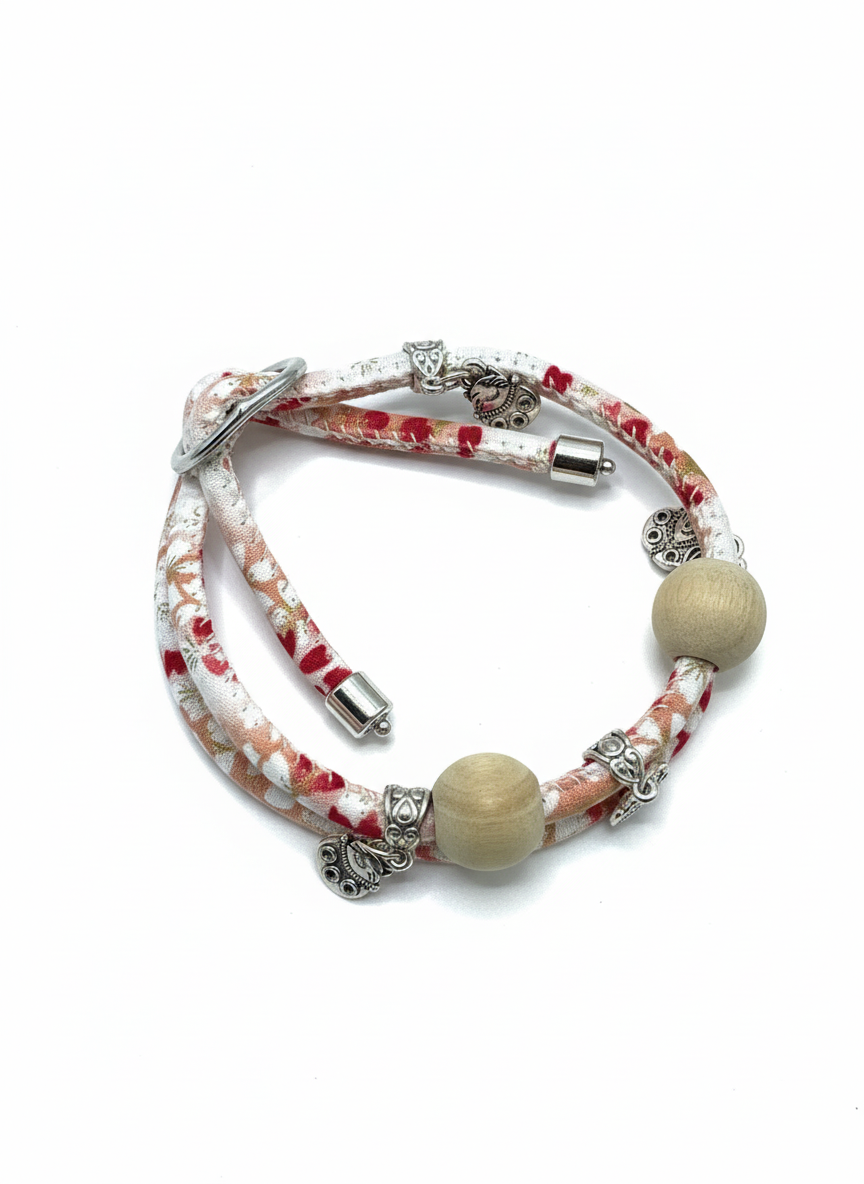 • Material and Design: The leash or collar is made from a thin cord that is wrapped in a patterned fabric, featuring a mix of red, white, and tan floral or abstract designs. The fabric adds a soft, unique texture and aesthetic.