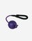 Rope and Handle: A thick, purple woven rope extends from the ball and connects to a black, cushioned foam handle. The handle is designed to provide a comfortable and secure grip for the owner during playtime.