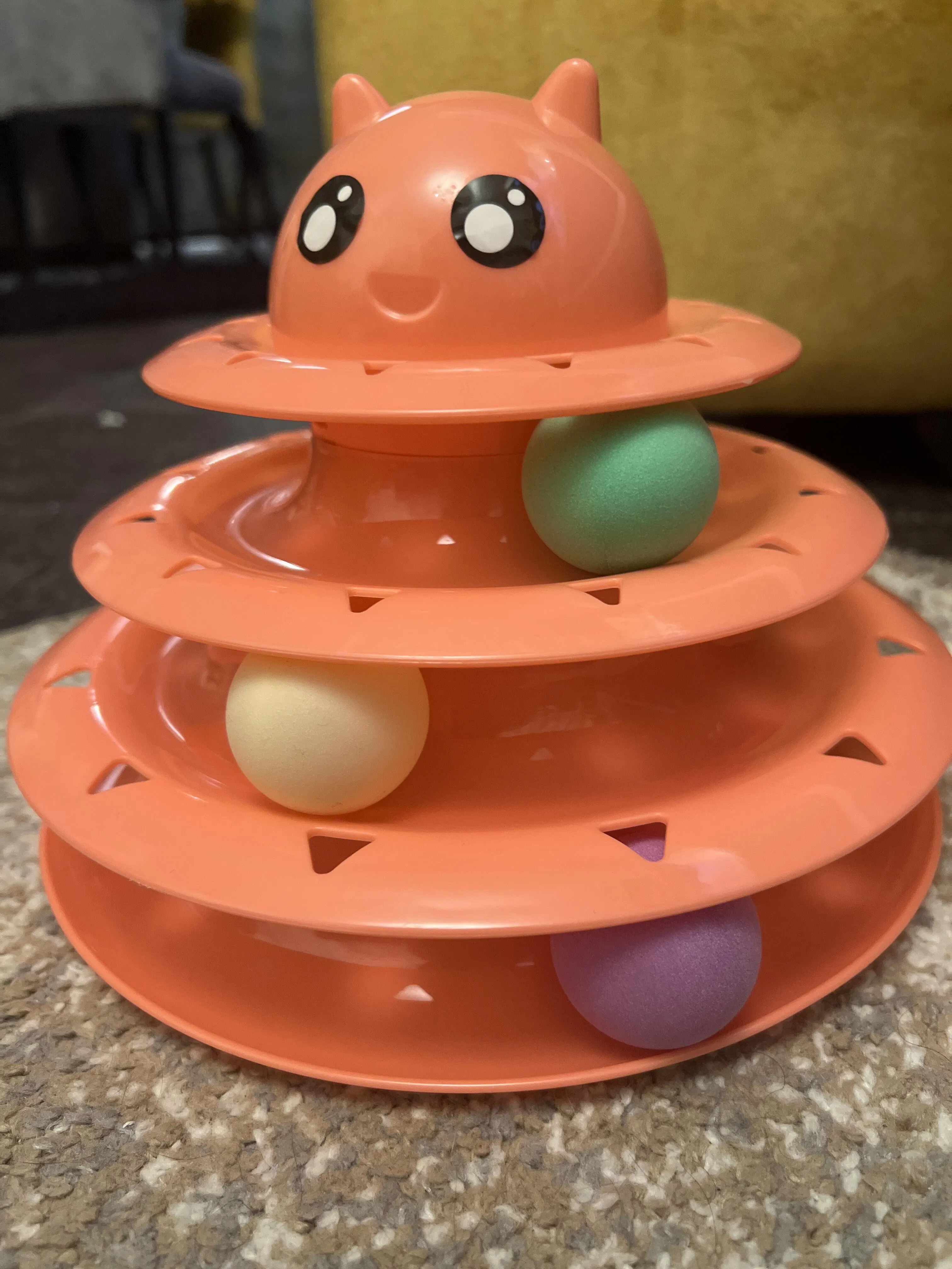 Structure: Three concentric circular tracks (floors) stacked vertically, each with its own ball for your cat to bat and chase.
