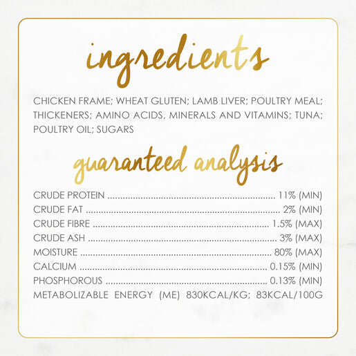 Chicken frame; Wheat gluten; Lamb liver; Poultry meal; Thickeners; Amino acids, Minerals And vitamins; Tuna; Poultry oil; Sugars